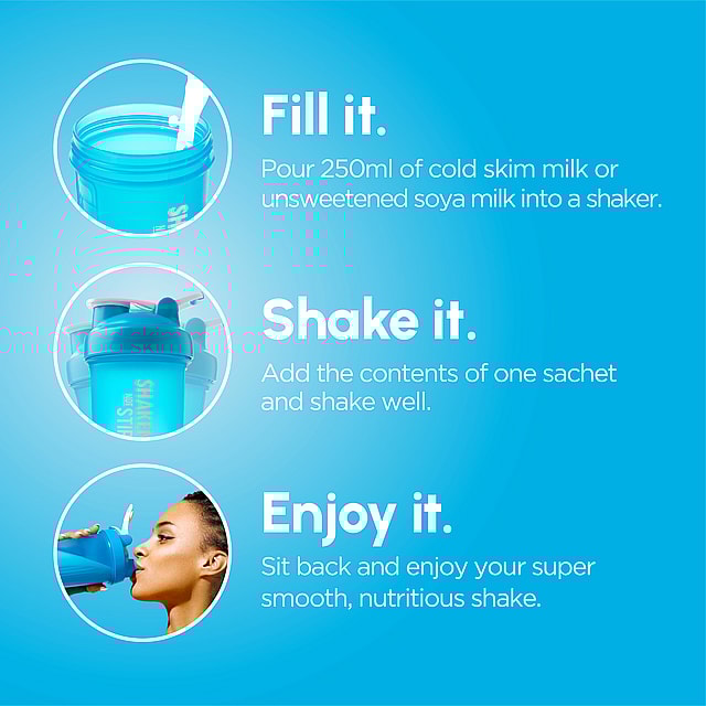 • Pour 250ml of skim milk or unsweetened soya milk into a shaker bottle.