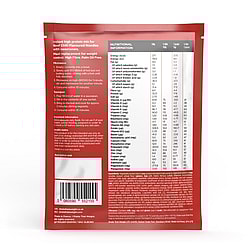 Vegetable protein blend (soy protein textured (malt extract), vegetable protein); egg noodles (durum wheat flour (gluten), egg yolk, niacin, ferrous sulfate, thiamine mononitrate, riboflavin, folic acid); dehydrated vegetable (dehydrated onion, tomato powder, red bell pepper, sweet corn piece) ; vegetable oil preparation (sunflower oil and refined soybean oil, maltodextrin, milk protein, emulsifier: soy lecithin E322, antioxidants: ascorbyl palmitate E304, alpha tocopherol E307); chilli powder seasoning (chilli, cumin, garlic, pepper, oregano, salt, colour: caramel E150c, dextrose, aromatic caramel); acidity regulators: potassium chloride E508, potassium citrate E332, magnesium oxide E530; flavours; thickener: modified starch E1422; maltodextrin; vitamin and mineral mix (dicalcium phosphate, L-ascorbic acid (vit. C), nicotinamide (vit. B3), ferric pyrophosphate, zinc oxide, D-alpha-tocopheryl acetate (vit. E), D-pantothenate calcium (vit. B5), sodium fluoride, manganese sulfate, pyridoxine hydrochloride (vit. B6), riboflavin (vit. B2), copper gluconate, thiamin hydrochloride (vit. B1), retinyl acetate (vit. A), pteroylmonoglutamic acid (vit. B9), potassium iodide, phylloquinone (vit. K1), sodium selenite, D-biotin (vit. B8), chromium chloride, ergocalciferol (vit. D2), cyanocobalamin (vit. B12)); colour: beetroot red E162; salt; stabilizer: calcium phosphates E341; antioxidant: tocopherol-rich extract E306; sweetener: sucralose E955.