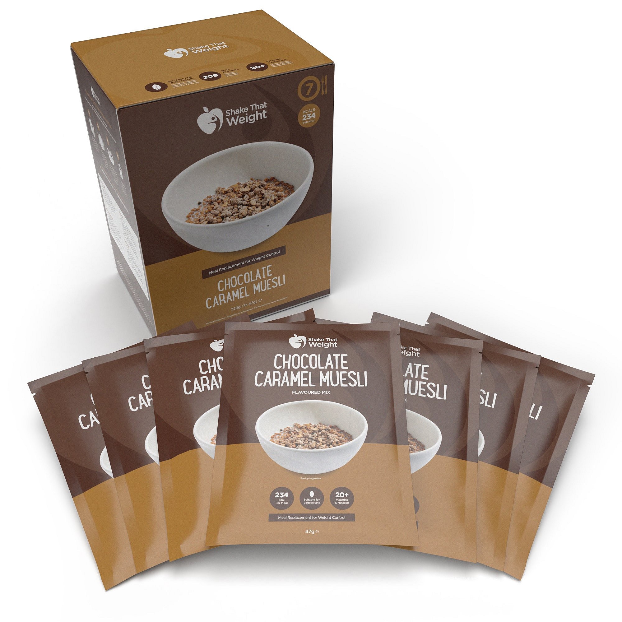 Chocolate Caramel Flavoured Muesli Granola (vegetable protein crisps (soy protein, starch); whole grain rolled oats (gluten); sugar; brown cane sugar; sunflower oil; cocoa soy protein crisps (soy protein, cocoa (processed with alkali), starch); flavours; oligofructose (chicory root extract); fat reduced cocoa powder); vegetable oil preparation (refined soybean oil and sunflower oil, maltodextrin, milk protein, emulsifier: soy lecithin E322, antioxidants: ascorbyle palmitate E304, tocopherol E307); maltodextrin; oligofructose (chicory root extract); skim milk powder; flavours ; stabilisers: tricalcium phosphate E341, dipotassium phosphate E340, magnesium phosphate E343; vitamin and mineral mix (potassium citrate, L-ascorbic acid (vit. C), nicotinamide (vit. B3), D-alpha-tocopheryl acetate (vit. E), ferric pyrophosphate, zinc oxide, D-pantothenate calcium (vit. B5), manganese sulfate, pyridoxine hydrochloride (vit. B6), copper gluconate, thiamin hydrochloride (vit. B1), riboflavin (vit. B2), retinyl acetate (vit. A), pteroylmonoglutamic acid (vit. B9), potassium iodide, phylloquinone (vit. K1), sodium selenite, D-biotin (vit. B8), ergocalciferol (vit. D2), cyanocobalamin (vit. B12)); acidity regulators: magnesium oxide E530, potassium chloride E508, sodium citrate E331; antioxidant: tocopherol E306.