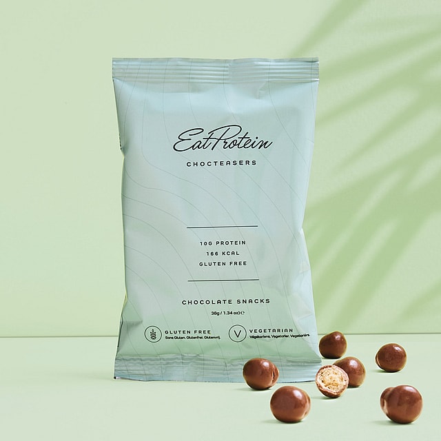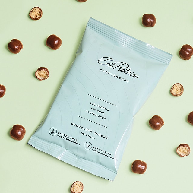 Milk chocolate coating with sweetener (sweetener: maltitol E965, cocoa butter, whole milk powder, cocoa mass, emulsifier: soy lecithin E322, natural vanilla flavour); soy puffs (soy protein, rice starch, rice flour, sugar, anticaking agent: calcium carbonate E170).