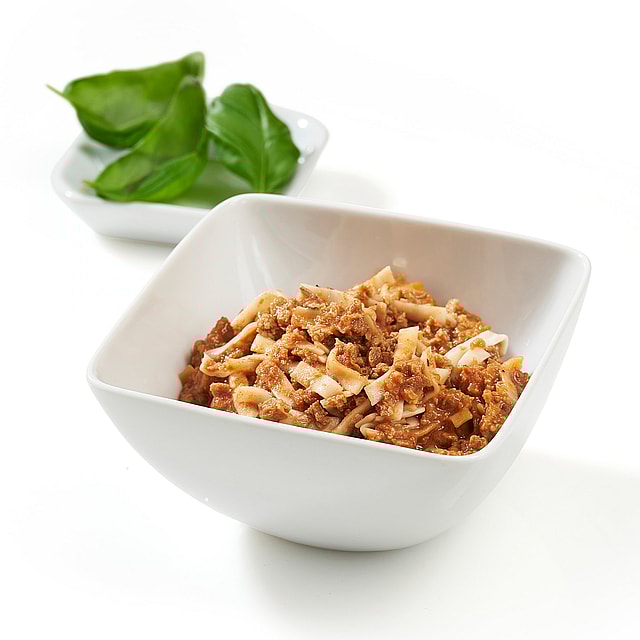 Soy protein concentrate textured (colour: malt extract); egg noodles (wheat durum flour (gluten); egg; niacin; ferrous sulfate; thiamine mononitrate; riboflavin; folic acid); dehydrated vegetables (tomato powder, onions dehydrated, onion powder, organic garlic powder); vegetable oils preparation (sunflower oil and refined soybean oil; maltodextrin; milk protein; emulsifier: soy lecithin; antioxidants: ascorbyle palmitate, alpha tocopherols); pea protein isolate; thickener: corn starch; flavourings (milk); stabilizers: tricalcium phosphate, magnesium phosphate; salt; hydrolyzed vegetable protein; vitamin and mineral mix (L-ascorbic acid (vit. C), nicotinamide (vit. B3), alpha- tocopherol acetate (vit. E), zinc oxide, ferric pyrophosphate, calcium D-pantothenate (vit. B5), manganese sulfate, pyridoxine chlorhydrate (vit. B6), riboflavin (vit. B2), thiamin chlorhydrate (vit. B1), copper gluconate, retinol acetate (vit. A), pteroylmonoglutamic acid (vit. B9), potassium iodide, phylloquinone (vit. K1), sodium selenite, D-biotin (vit. B8), ergocalciferol (vit. D2), cyanocobalamin (vit. B12)); acidity regulators: potassium chloride, citric acid, magnesium oxide; colours: caramel, beet juice, lycopene; herbs; spices; antioxidants: tocopherols.